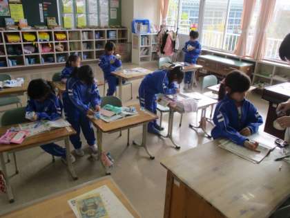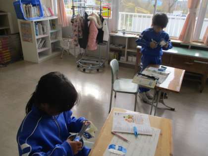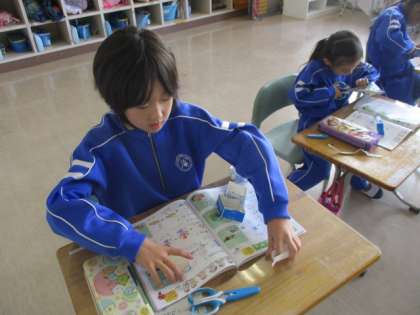 1・2年生の図工の授業のようすです。子どもたちは、牛乳パックを使って、おもちゃ作りをしていました。