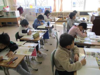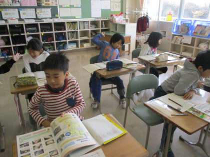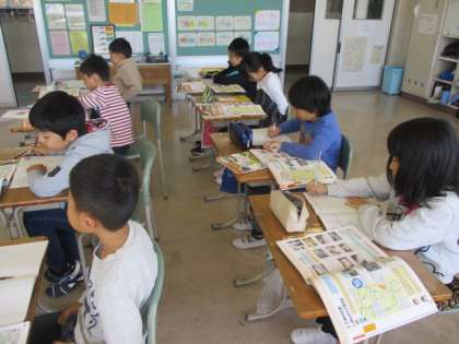 3・4年生の社会科の授業のようすです。工場の仕事をテーマに学習していました。子どもたちは、郡山市内の工業団地について調べていました。