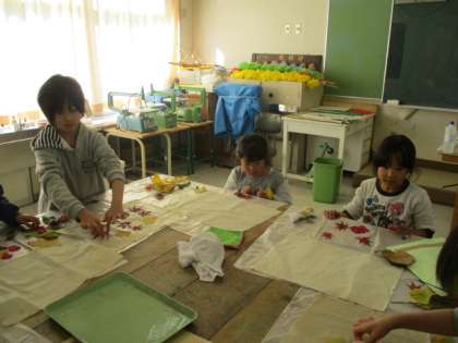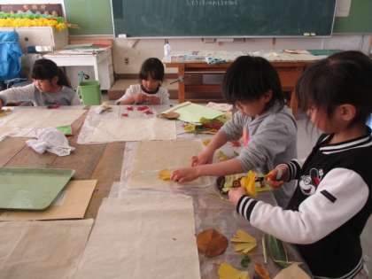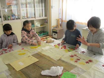 1・2年生の図工の授業のようすです。「はって ならべて いいかんじ」の学習をしていました。子どもたちは、イチョウやカエデなどの葉をきれいに並べて、和紙に貼り付けていました。