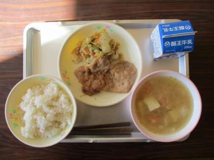 今日のこんだては、麦ごはん、牛乳、豚肉のアップルソース焼き、白菜の浅漬け、根菜汁でした。