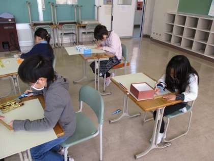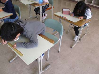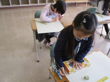 2年生の算数の授業のようすです。はこの形をテーマに学習していました。子どもたちは、箱を方眼紙の上にのせて、箱の形を写しとっていました。