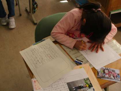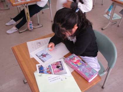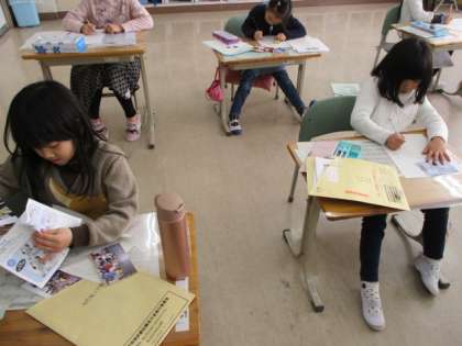 1年生の生活科の授業のようすです。「あしたへ ジャンプ」の学習をしていました。子どもたちは、スキー教室の写真を見ながら、スキー教室の思い出をカードに書いていました。