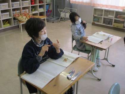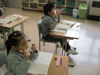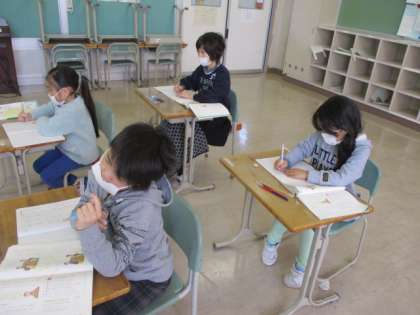 2年生の国語の授業のようすです。考えを出し合おうをテーマに学習していました。子どもたちは、話し合いに向けて、自分の考えをノートに書き出していました。