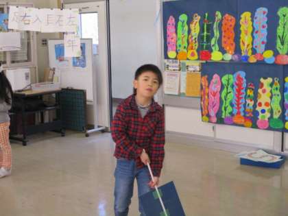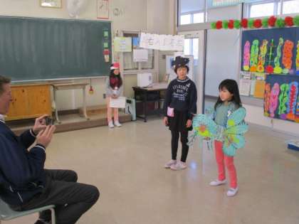 1・2年生の英語表現の授業のようすです。子どもたちは、「スイミー」の英語劇をベンジャミン先生の前で発表しました。