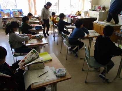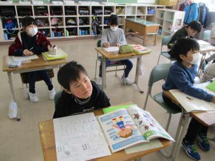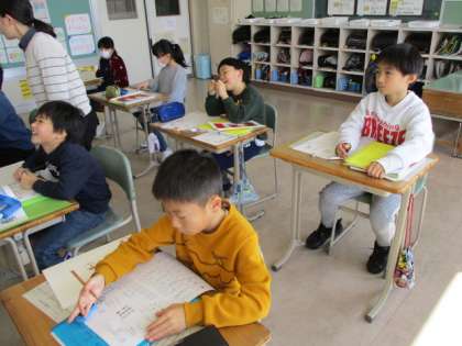 3・4年生の英語表現の授業のようすです。自己紹介をテーマに学習していました。子どもたちは、自分のプロフィールを英語で表現していました。