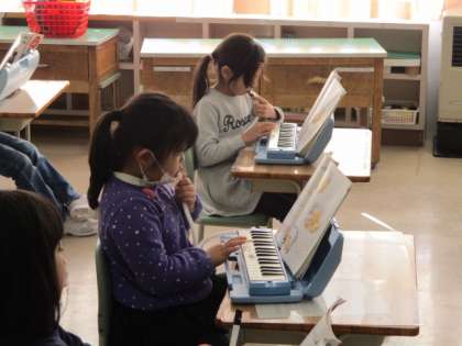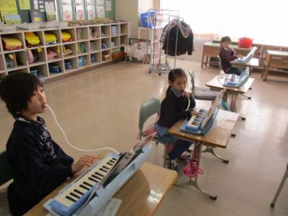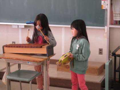 1・2年生の音楽の授業のようすです。合奏をしていました。子どもたちは、楽器を分担して、「小ぎつね」を演奏していました。