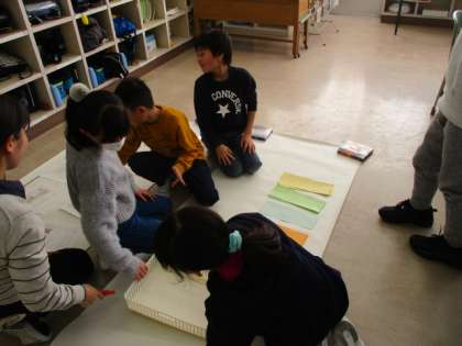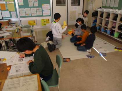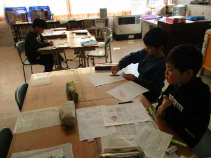 3・4年生の社会科の授業のようすです。古い道具と昔のくらしをテーマに学習していました。子どもたちは、各自がまとめたものを合わせて、掲示用の資料を作っていました。