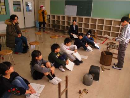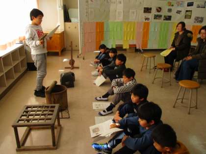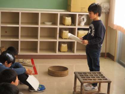 3・4年生は、社会科の学習で、古い道具について調べた成果を、一人ずつ発表していました。