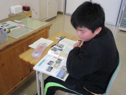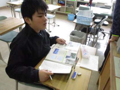 6年生の理科の授業のようすです。人と環境をテーマに学習していました。教科書の資料を見ながら、自分たちの生活と環境との関わりについて、考えていました。