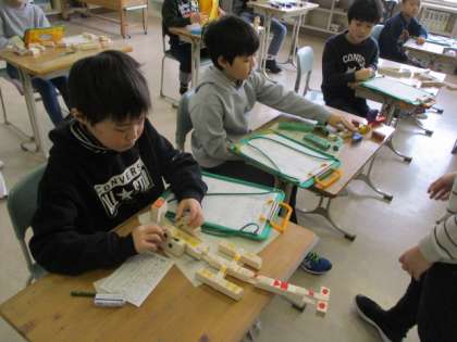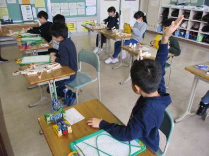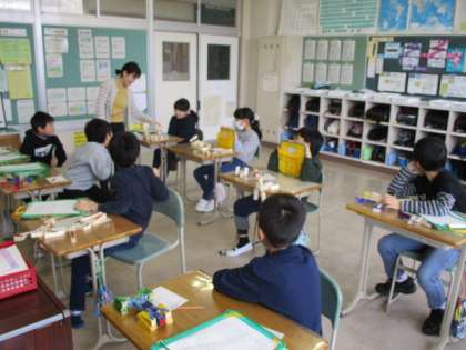 3・4年生の図工の授業のようすです。「トントンつないで」の作品を鑑賞していました。子どもたちは、お互いの作品の気に入ったところを発表していました。