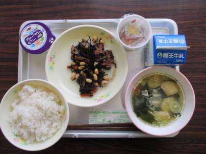 今日のこんだては、麦ごはん、牛乳、納豆、ひじきのいため煮、油揚げとわかめのみそ汁、ゼリーでした。