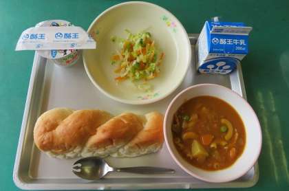 本日の献立は、ツイストパン、牛乳、マカロニのカレー煮、キャベツサラダ、ヨーグルトでした。