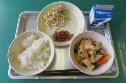 本日の献立は、ご飯、牛乳、若竹煮、野菜のみそマヨネーズあえ、かつお手づくりふりかけでした。