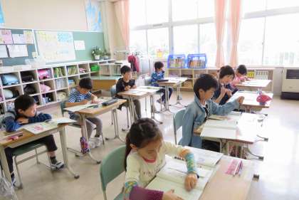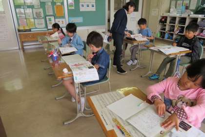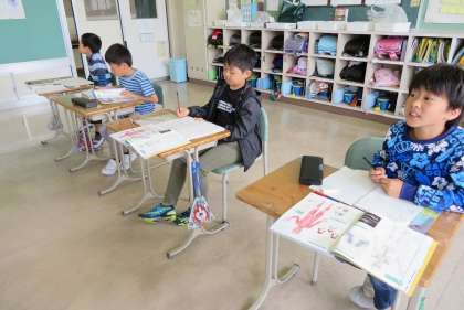 3・4年生の理科の授業のようすです。人の体のつくりについて学習していました。子どもたちは、顔の筋肉の働きについて、自分の予想をもとに話し合っていました。