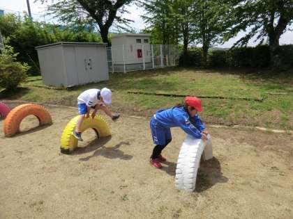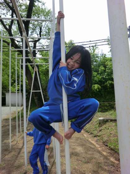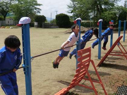 1・2年生の体育科の授業のようすです。校庭にある固定施設を使って、いろいろな動きを学習しています。今までできなかった動きも、教え合いながら練習をするうちにできることが増えてきました。