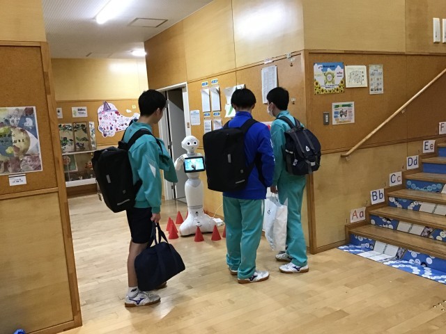 小学部の子どもたちが帰った後、中学部の生徒もペッパー君のまわりに集まってきます。「僕と遊びませんか?」と声をかけてくるペッパー君に中学部の生徒も興味津々です。