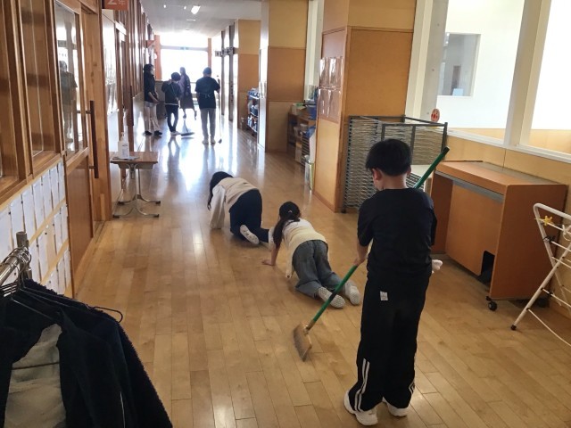 月曜日に縦割り清掃についてのオリエンテーションがあり、火曜日から縦割り清掃が始まりました。1年生から4年生の低ブロック、5年生から7年生の中ブロックでグループを組み、正しい清掃の仕方を身に付けるとともに、リーダー性を高める目的もあります。下級生は上級生に掃除の仕方を教わりながら、みんなで協力して清掃をがんばっています。