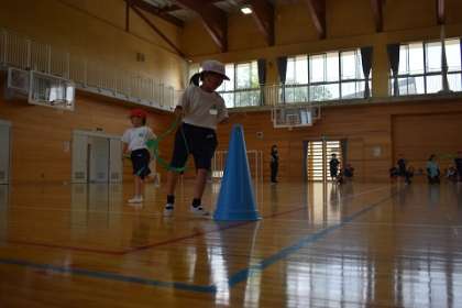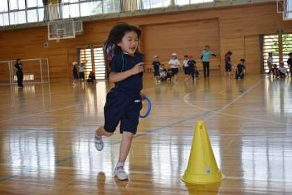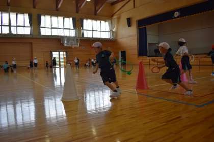 今日の授業の最後にはリレーに挑戦! 1年生は初めてのリレーだったので、担任の先生の話をよく聞いてから始めました。全力で走り、コーンを回ってから次の友達にバトンパス! 全員がんばって走りぬきました!