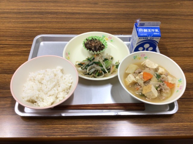今日のメニューは、麦ごはん、ひじきの手作りふりかけ、生揚げの肉みそ煮、からしあえ、牛乳です。