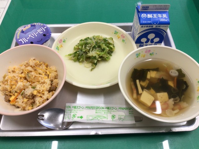「目の愛護デー献立」キムチチャーハン、春雨のごま酢あえ、わかめスープ、ブルーベリーゼリー、牛乳です。