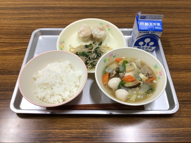 今日のメニューは、ごはん、豚肉と野菜の中華煮、えびシューマイ、もやしのラー油あえ、牛乳です。