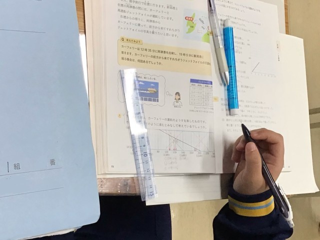 1次関数のグラフの利用で、〈ダイヤグラム〉の問題です。ダイヤグラムは、時間や距離(位置)、速さ等を視覚的に捉えることができます。乗り物等の動きが可視化されるため、状況をわかりやすく把握することができます。