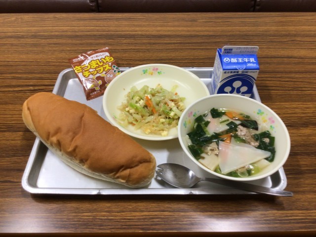 今日のメニューは、コッペパン、ワンタンスープ、カミカミサラダ(カミカミ)、さつまいもチップス、アップルジャム、牛乳です。