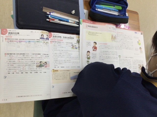 今日は〈A.家族・家庭生活〉で、家庭のはたらきと家庭の仕事について教科書で学んでいます。