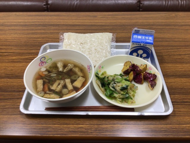 今日のメニューは、五目うどん、大学いも、おかかあえ、牛乳です。