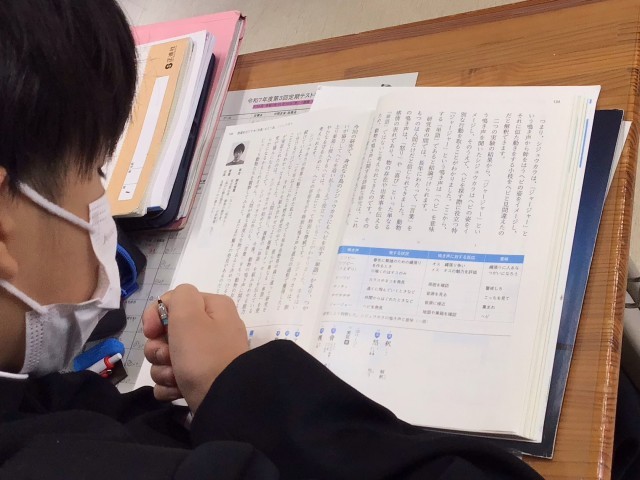 定期テストⅢも近づいてきているので、前時までの復習をした後、新しい単元 筋道を立てて〈『言葉』をもつ鳥、シジュウカラ〉に入りました。