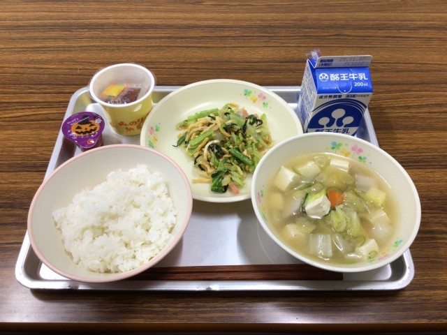 今日のメニューは、ごはん、納豆、小松菜と玉子のあえもの、けんちん汁、ミニゼリー、牛乳です。