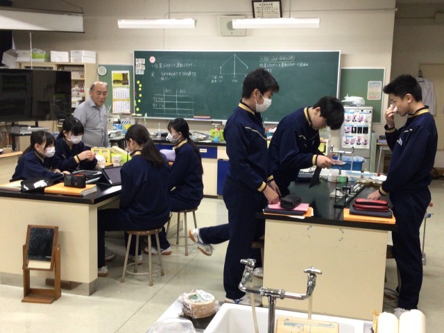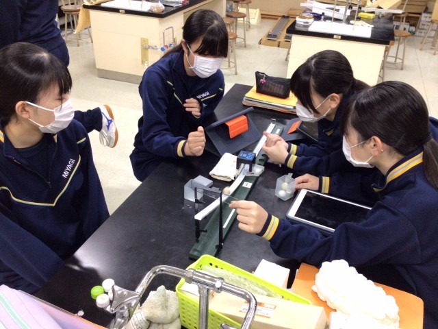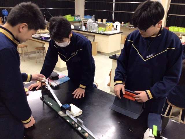 レールの上を小球を転がして、その高さや質量によって速度がどう変わるのかを確かめる実験です。簡易速度計を使い、小球の速さを測定します。小球が通過すると、秒速や時速で瞬時に速度が計測できるので、いろいろ試したくなりますね。