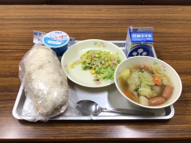 今日のメニューは、きなこ揚げパン、ポトフ、コーンサラダ(フレンチ味)、ヨーグルト、牛乳です。