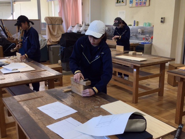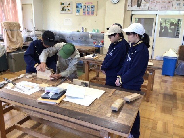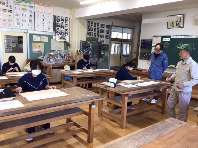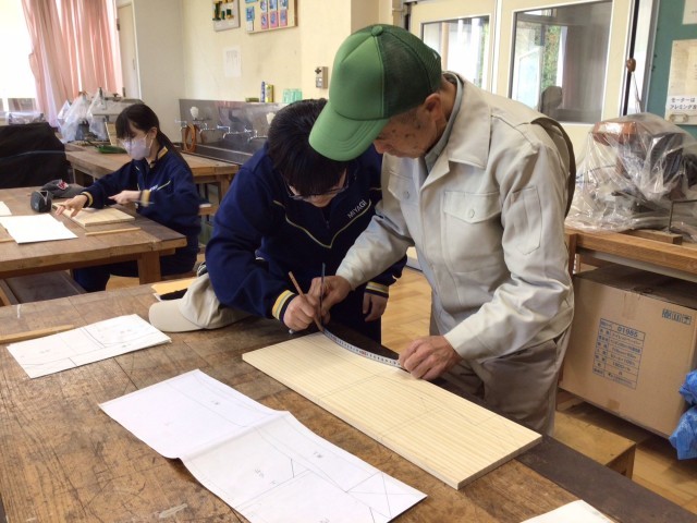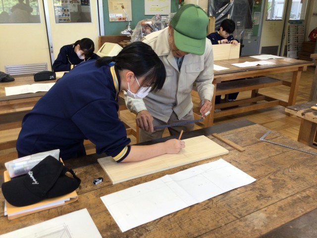 けがきが終わり、その後のこぎり挽きの練習とかんながけ方の説明と手本、練習も行いました。次回は材料の切断と部品の加工などを行います。