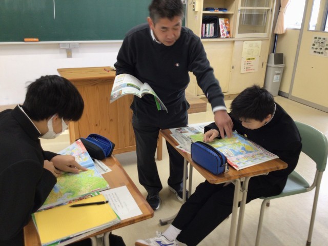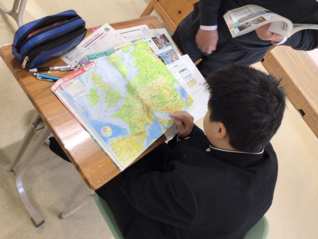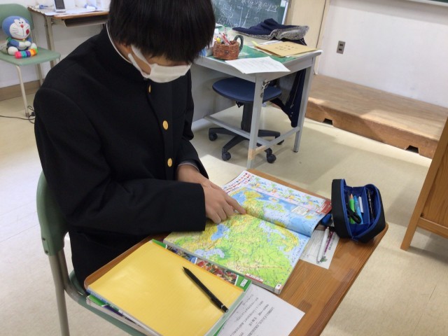 ヨーロッパの国々や河川、半島などを地図上で確認しています。担当の先生独自の覚え方のコツもあるようです。