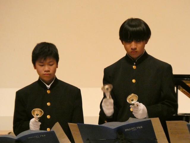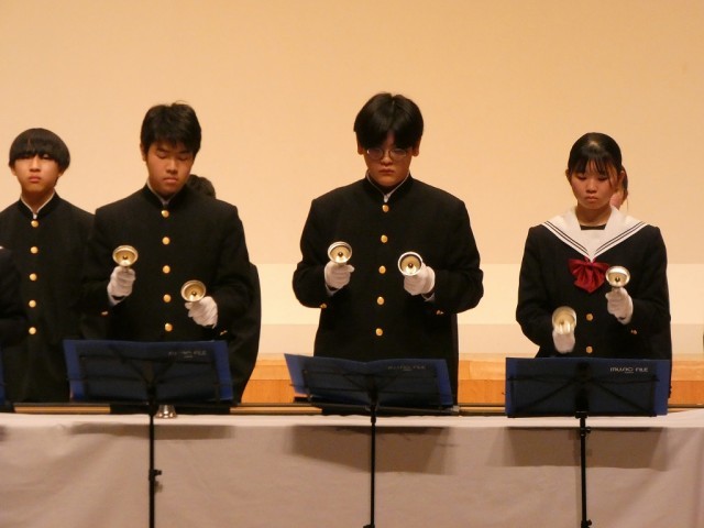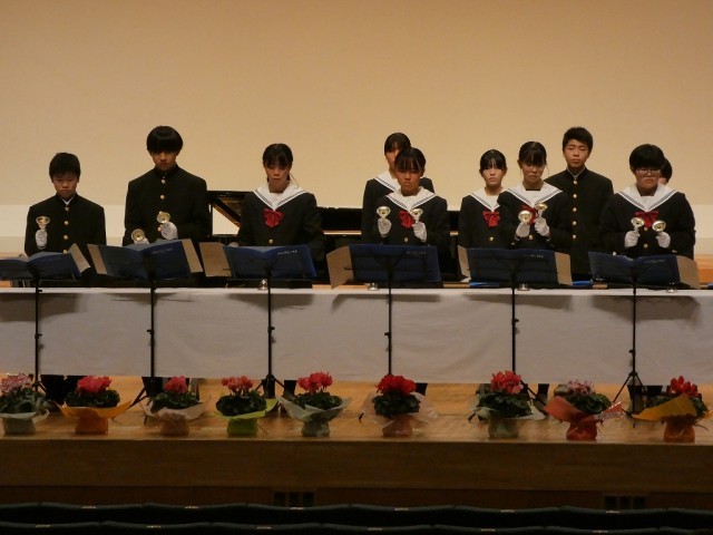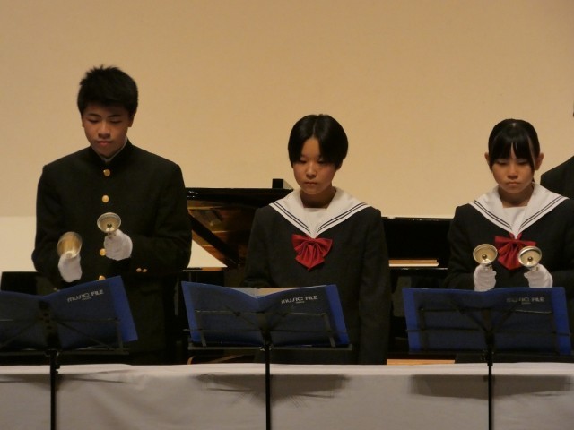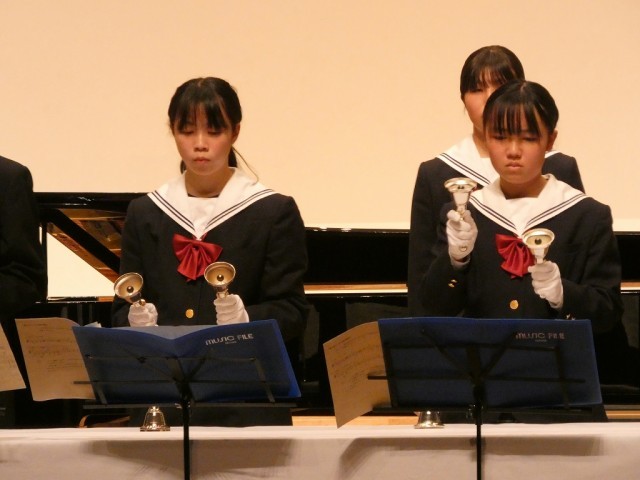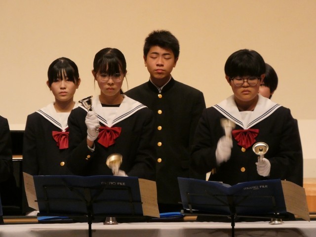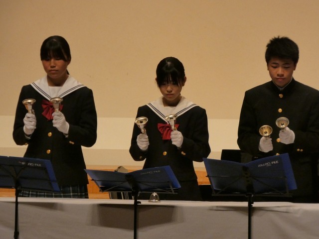 本校は、全校生徒17名の市内で最も少人数の学校ですが、例年ハンドベル演奏と全校合唱の発表の機会をいただいており、今年も学校をあげて参加準備を進めてきました。夏休み前からハンドベルの練習をはじめ、夏休みの公民館主催のハンドベル講習会、中田町の地域行事〈秋蛍〉、校内文化祭〈秋桜祭〉と練習と発表を重ねながら、本日の音楽学習発表会を迎えました。