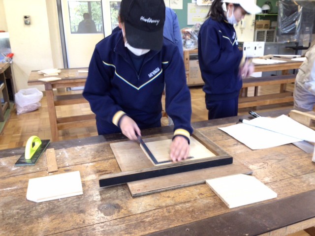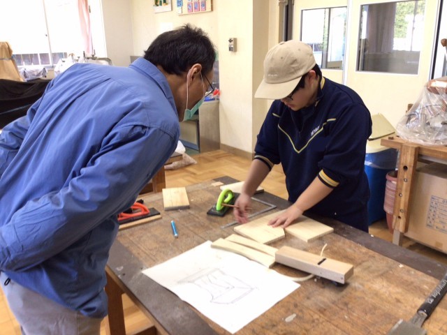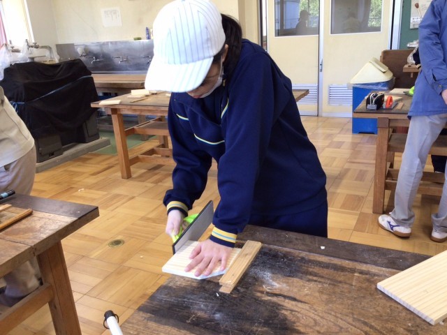 前時で切断が終わり、今日は次の組立てのための準備にあたる各部品の加工・調整を行っています。サンダーを使って寸法を合わせたり表面を滑らかにしたりしました。ここまでが大変でしたね。さあいよいよ次回は、組立てです。釘打ちを行うと本立ての形に組み上がります。楽しみです。講師の先生がいらっしゃるのはあと2回(4時間)です。