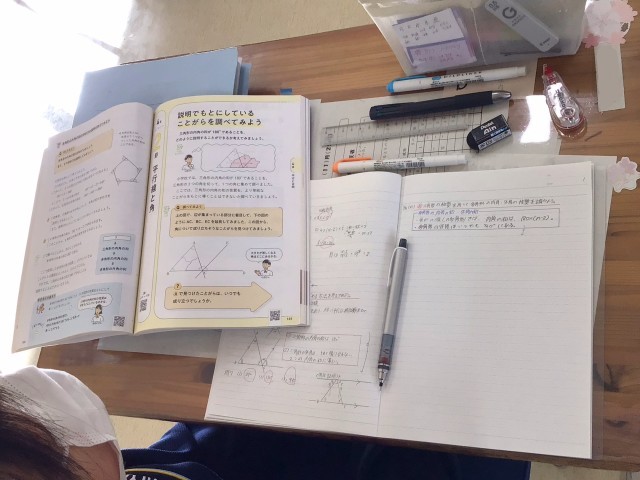三角形の性質を使って、〈三角形の内角の和〉の公式や〈三角形の外角の和〉の値を、導いています。どちらも、中学校数学の図形の単元でとても重要な内容ですね。