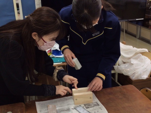 篆刻の作品作りです。印面のデザインが決まった人は、高麗石の印面を紙やすりで平にしてデザインを張り付けて、いよいよ彫りに入っていきます。
