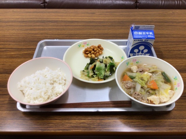 今日のメニューは、麦ごはん、すきやき煮、豆みそ、わかめと野菜のあえもの、牛乳です。