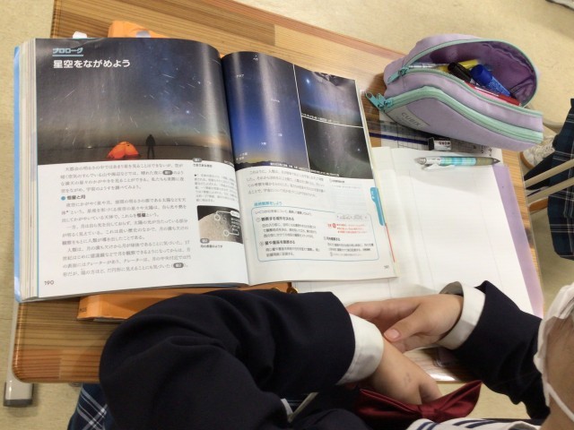 日中では見られない夜空の星も、PCやタブレットを使って動画で簡単に見ることができます。机を地球を真ん中にしたときの天体をイメージした配置にしていました。天球儀みたいなものでしょうか。