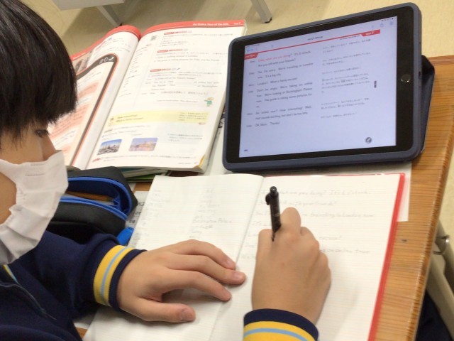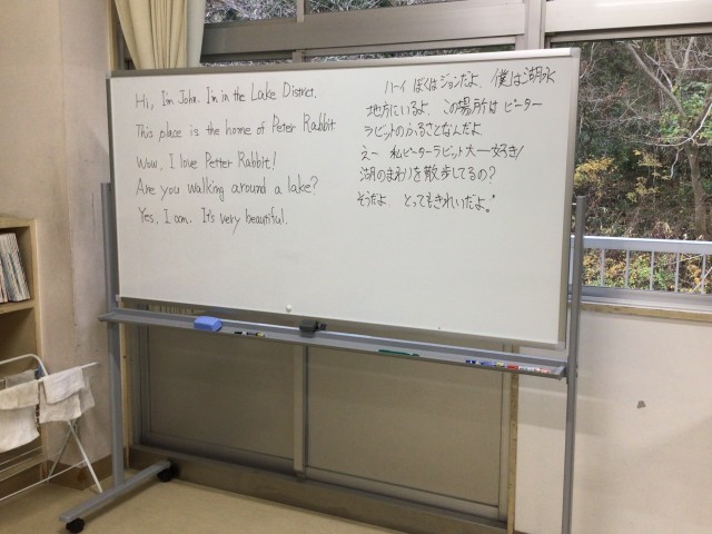 教室には、いつも英文に触れられるように、教科書の本文が書かれたホワイトボードを担任が置いています。時々、一部を空欄にしたりして工夫しています。