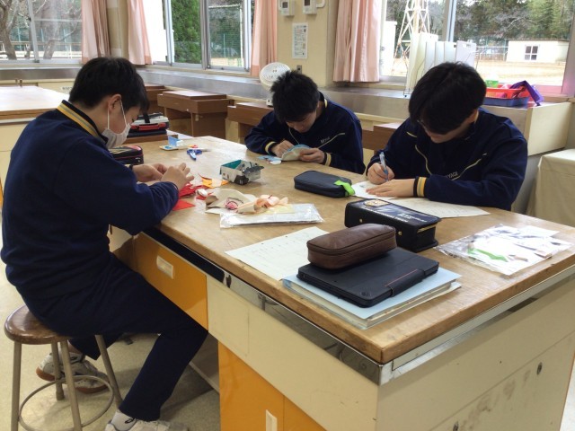 パペット作製。パーツの仕上げをし、周囲縫い(並縫い)を進めています。