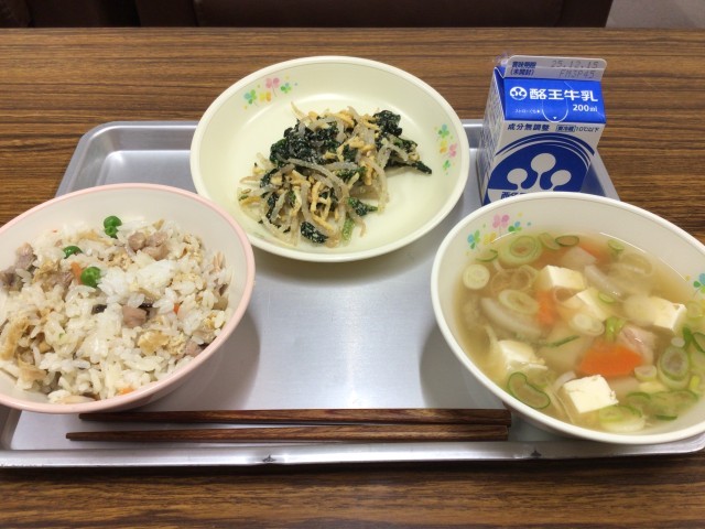 とりごぼうごはん、ほうれん草のごまあえ、石狩汁、牛乳です。