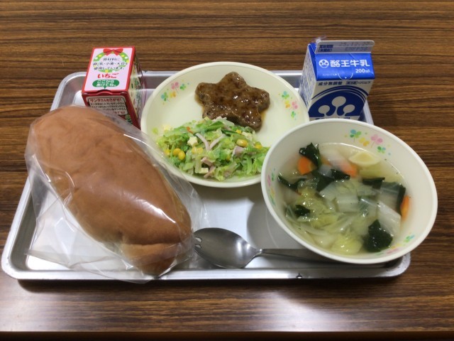 今日のメニューは、コッペパン、照焼きハンバーグ、フレンチサラダ、野菜スープ、クリスマスケーキ(チョコorイチゴ)、牛乳です。