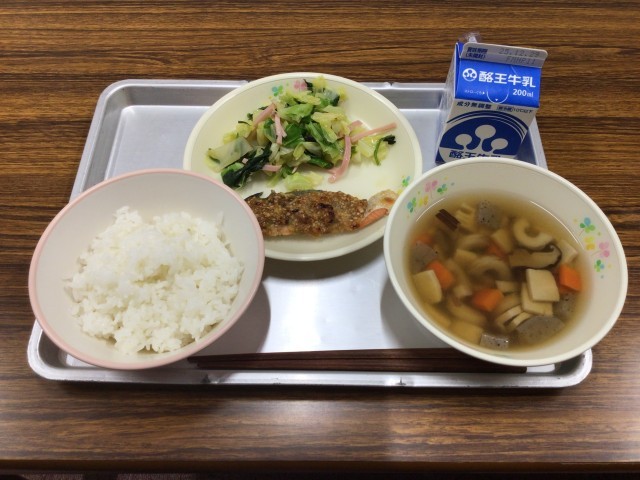 今日のメニューは、ごはん、鮭の三味焼き、重(じゅう、湖南町の郷土料理)、からしあえ、牛乳です。
