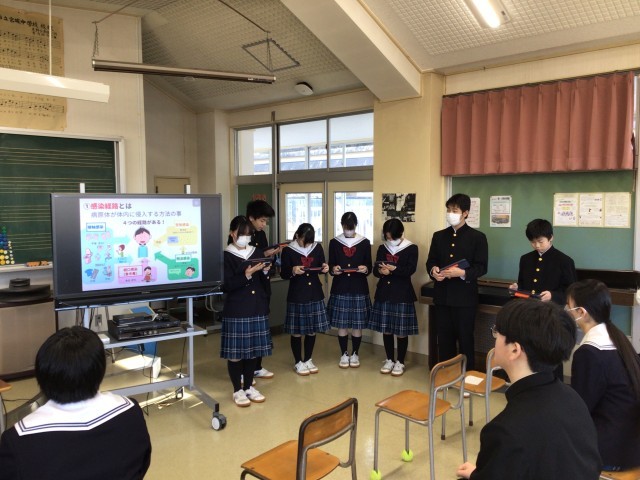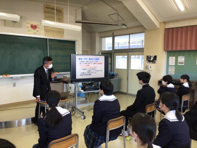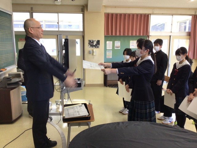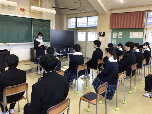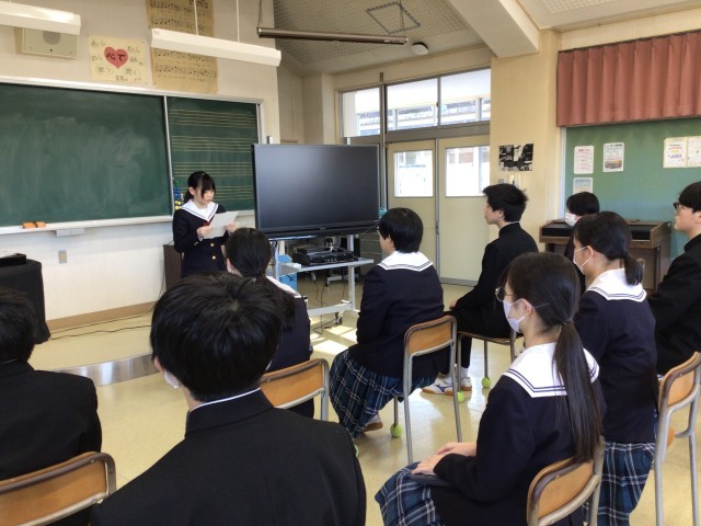 生徒発表。学年代表生徒が2学期の反省と冬休みの計画を発表。