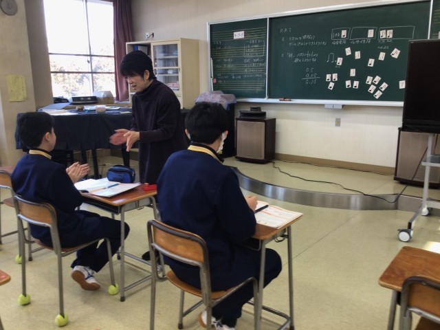 リズムを正しく理解する授業です。黒板に様々な音符や休符のカードが貼ってあります。