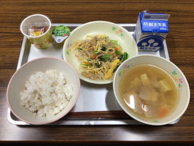 今日のメニューは、麦ごはん、納豆、千草あえ、里芋のみそ汁、ミニゼリー(洋梨)、牛乳です。