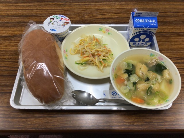今日のメニューは、コッペパン、すいとん、バンサンスー、ヨーグルト、牛乳です。
